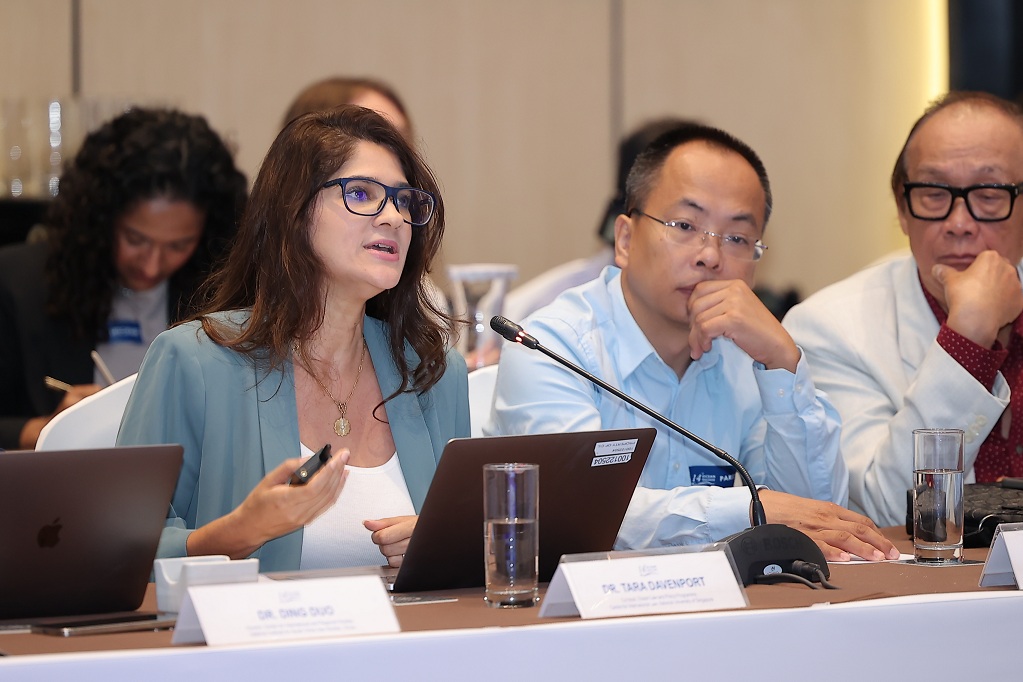 Tara Davenport, Giám đốc chương trình luật và chính sách đại dương, Trung tâm Luật quốc tế, Đại học Quốc gia Singapore phát biểu trong Đối thoại. Ảnh: Ngọc Anh.